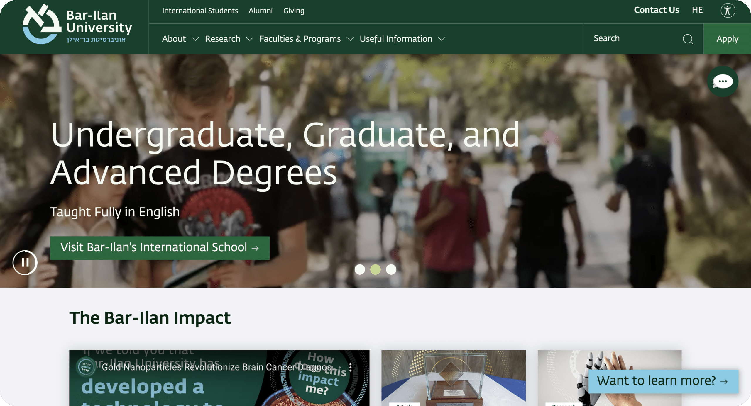 Bar Ilan University (BIU) is a public research university and Israel’s second-largest academic institution. It serves 20,000 students and features nine faculties, including Life Sciences, Social Sciences, Jewish Studies, Medicine, Law, and more.