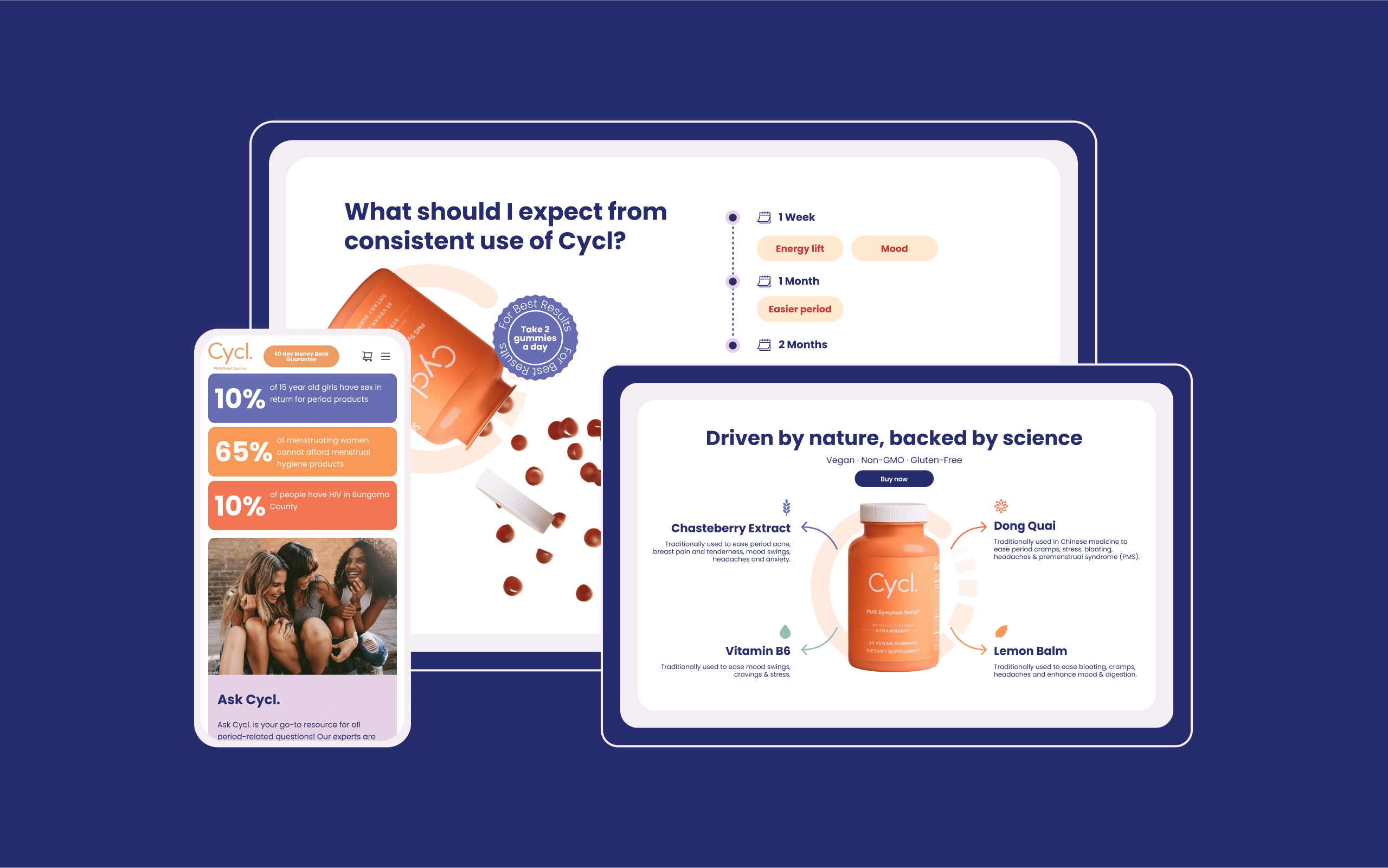 Seamless Blend of Marketing and Information: To build credibility and trust, we leveraged Cycl Health's deep knowledge of PMS. Informative sections were integrated throughout the site, educating visitors about PMS in an accessible way while reinforcing the brand's expertise. This combination ensured a balance between driving sales and providing valuable knowledge to the audience.