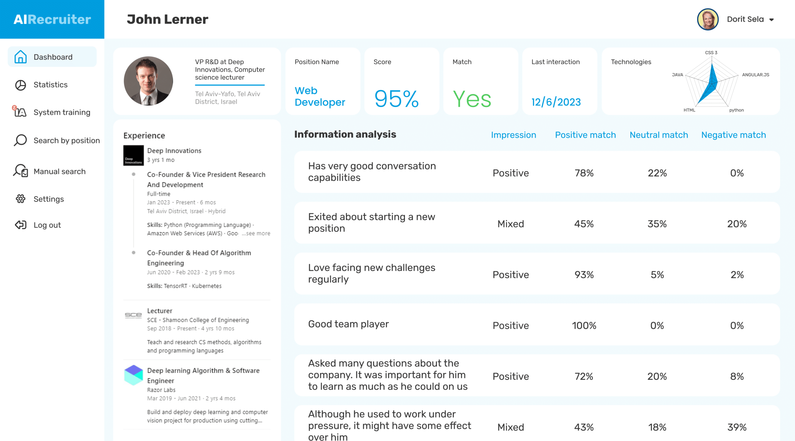 Contextual Sentiment Analysis & Predictive Scoring: Beyond mere data collection and aggregation, our AI algorithms utilized contextual sentiment analysis. This meant that interview summaries and recruiter notes were interpreted for more than just their content - the AI considered the sentiment and context, understanding nuanced feedback better. As a result, each candidate was provided with a dynamically-generated matching score, streamlining the decision-making process for human recruiters.
